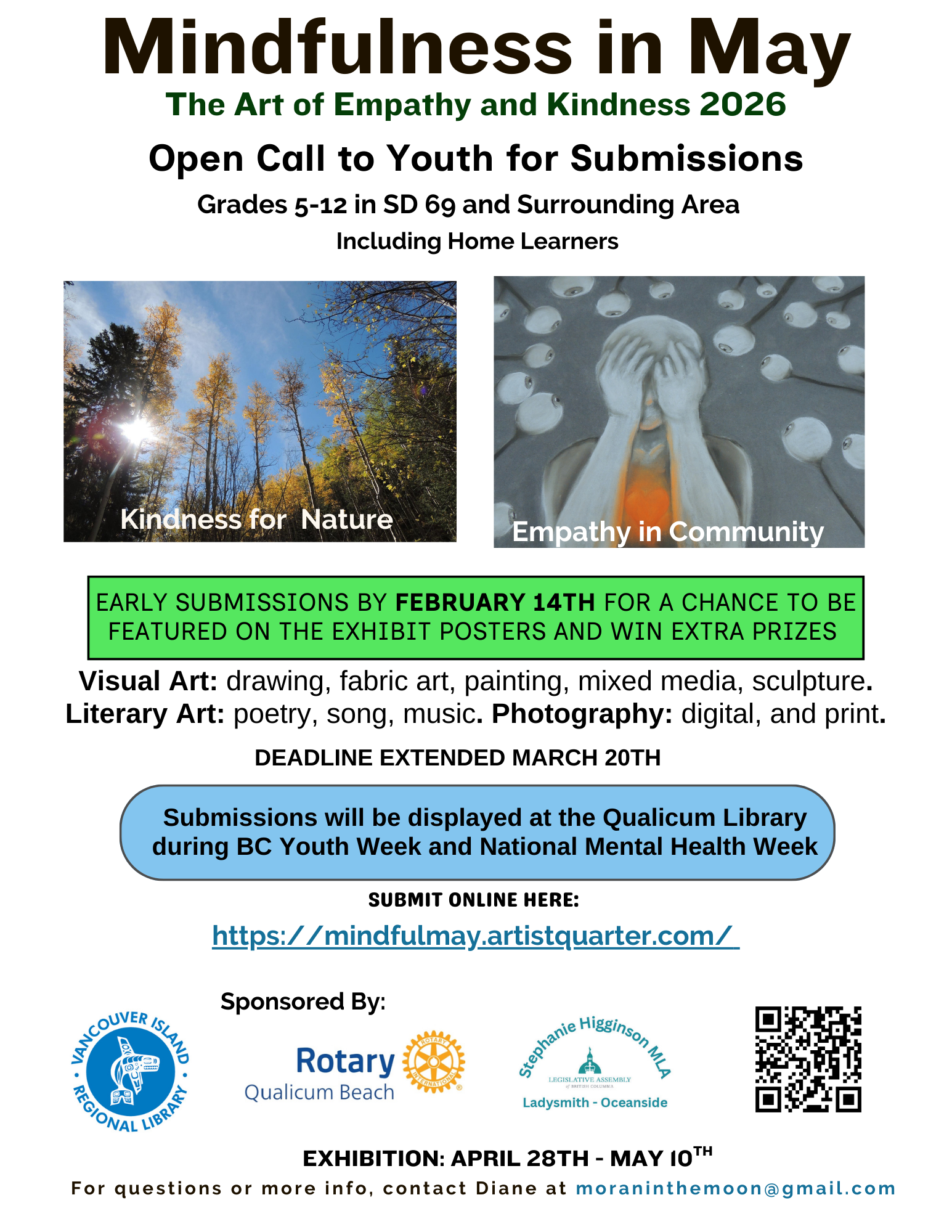 Founded and curated by Diane Moran, Mindfulness in May is supported by community partners including the Vancouver Island Regional Library (Qualicum Beach Branch) and local organizations committed to youth well-being, literacy, and mental health.